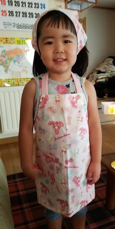 さてさて、次女ですが、保育園でクッキングをすることになったので実家の母がエプロン一式を作ってくれました。